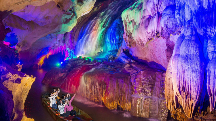 游客进入洞中,先步行游览一段,然后在洞中暗河边的码头上船,乘坐游船(费用自理),在水中赏沿河美景和石笋奇观。游船全程约15分钟,上岸后继续步行游览,此时能碰到神奇的洞中瀑布。洞中不走回头路,出口和入口不是一个地方,但相距不远。