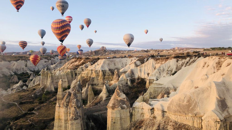 凌晨5:00前往热气球站乘坐热气球,随风飞向卡帕多奇亚的山谷,进行一次神奇的空中之旅,最后在农夫的田地中着陆。着陆后,给每人颁发一份证书,并赠送一杯香槟庆祝这次成功的空中历险。