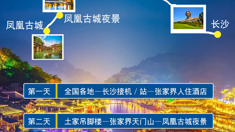 行程中所列景点/场馆首道大门票①武陵之魂—【天门山国家森林公园】(索道往返,玻璃栈道,天门洞,99道弯通天大道) ②乾州古城(乾州文庙,翦伯赞寄居,罗荣光故居,胡家塘) ③《仙剑奇侠传》茂茂的长安城——凤凰古城 |