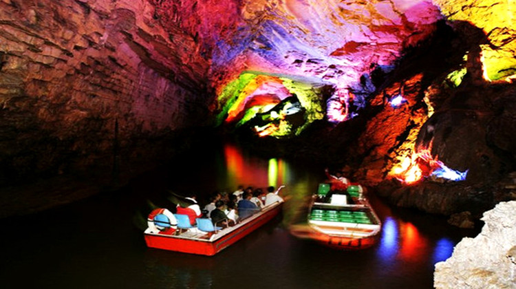 黄龙洞中“水陆兼备”的游览观光线路,也非常有意思。游客进入洞中,先步行游览一段,然后在洞中暗河边的码头上船,乘坐游船(费用包含在门票内),在水中赏沿河美景和石笋奇观。游船全程约15分钟,上岸后继续步行游览,此时能碰到神奇的洞中瀑布。洞中不走回头路,出口和入口不是一个地方,但相距不远。