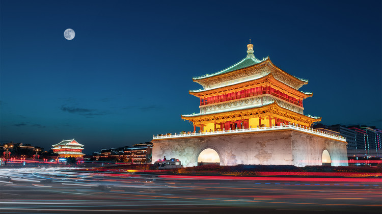 【西安钟鼓楼广场】位于西安市中心的东西南北四条大街的交汇处,面积达6万平方米,仅次于北京的天安门广场。广场东侧为有着600多年历史的钟楼,西侧为鼓楼。钟鼓楼广场上还建有音乐喷泉,夜幕降临,广场、钟楼、鼓楼的灯光都亮起的时候非常漂亮。即使不登钟、鼓楼,在广场上欣赏一下这唯美的夜景,也会有不一样的感受,许多漂亮的摄影照片都是在这里拍出的。